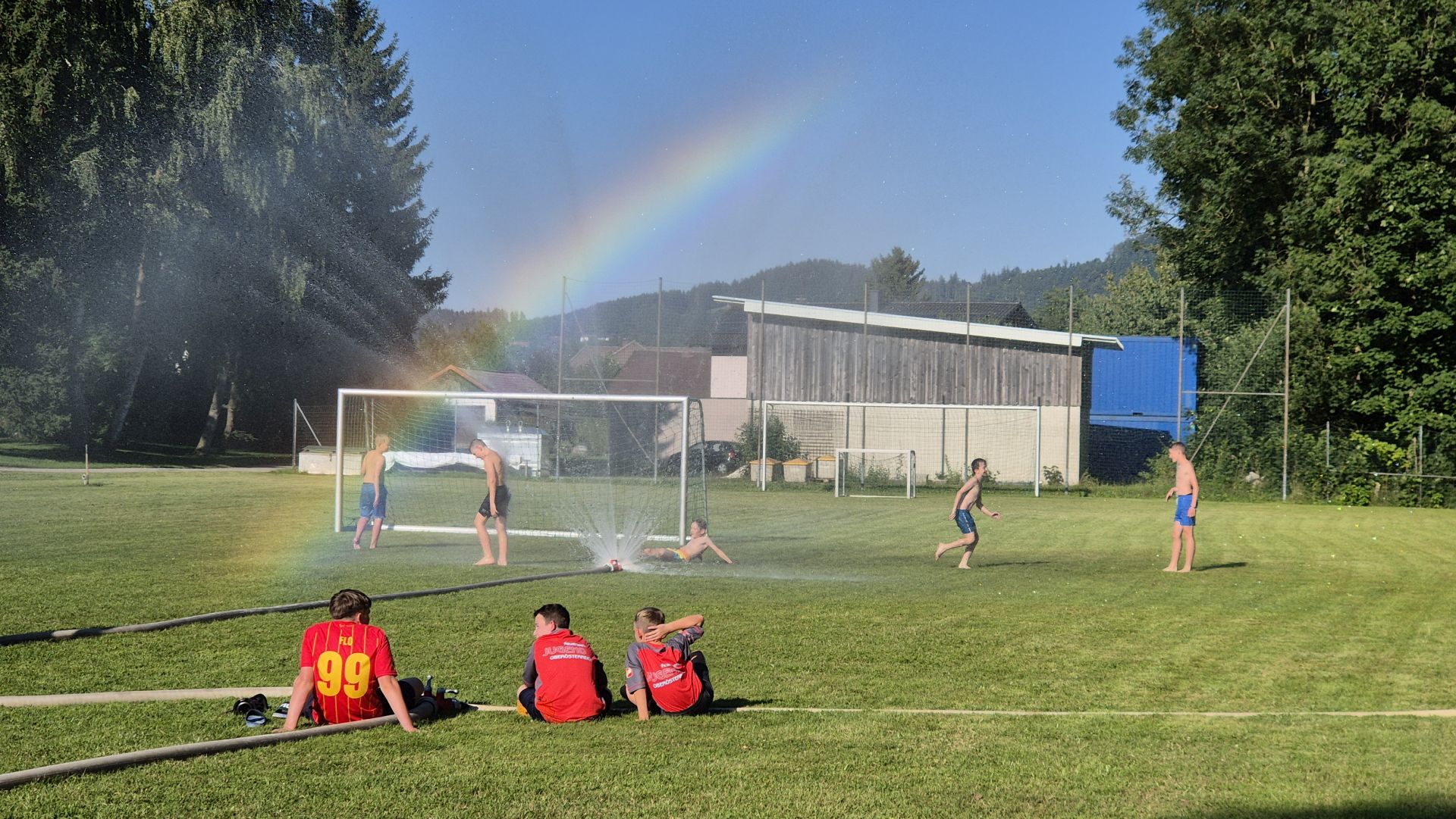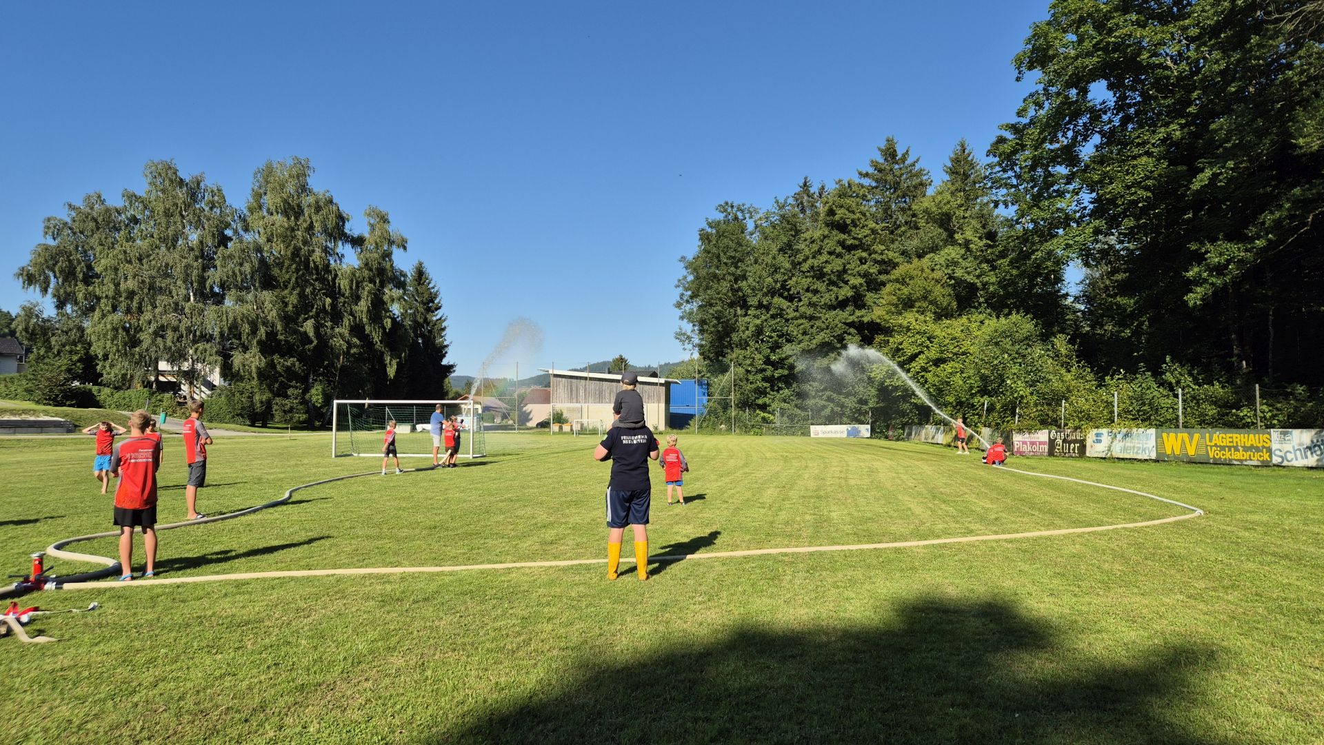 Nach dem Einrichten der Schlafplätze startete der warme Nachmittag mit einer Abkühlung bei einer Nasslöschübung am Sportplatz.